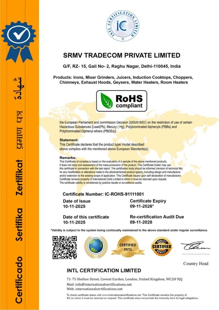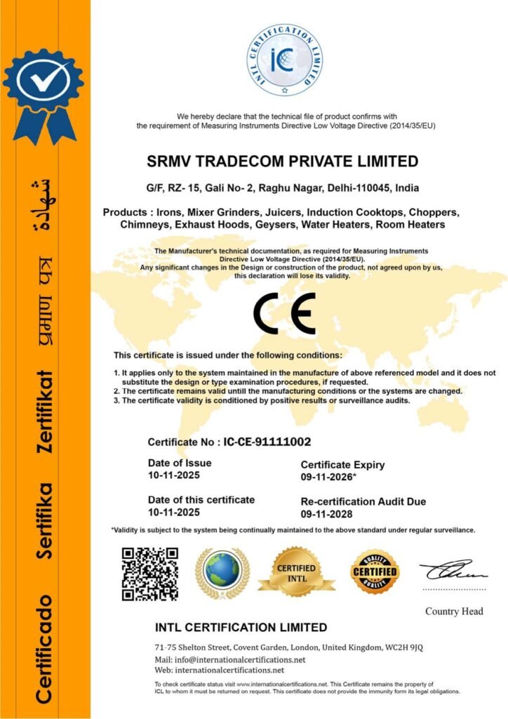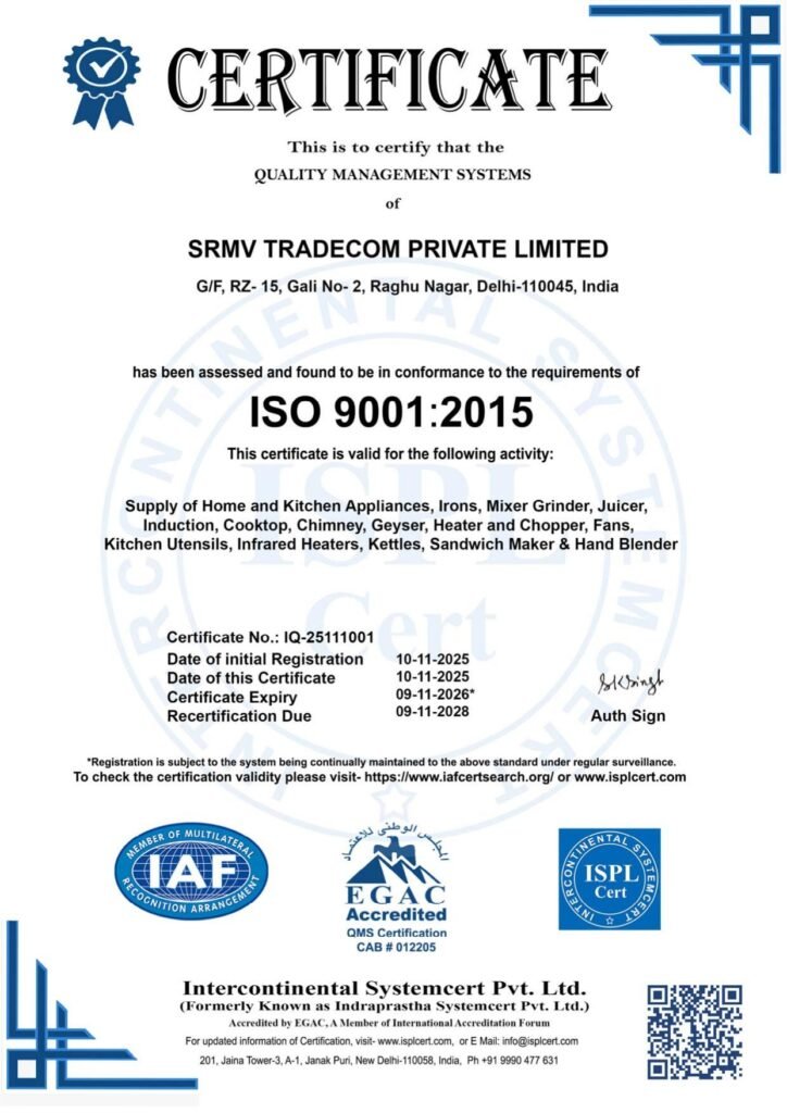 "I've been a loyal customer of SRMV Tradecom Pvt. Ltd for years, and they never disappoint. From kitchen appliances to air purifiers, I've found everything I need for my home under one roof. The best part is the quality - each product is reliable and long-lasting. Thank you, SRMV Tradecom Pvt. Ltd, for making my home a better place to live."